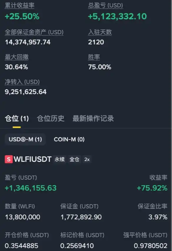 BlockBeats 消息,8 月 27 日,据加密 KOL AB Kuai.Dong 披露,「某神秘巨鲸 Zeta,在 8 月 24 日 WLFI 盘前价格,处于 0.4 附近的时候。陆续下达 32 张空单,从 0.4 美元做空开到了 0.33 美元,押注 WLFI 不断奔新低,即使当前收益率已达 75.9 %,总账户盈利 512 万美元,但他仍然没有平仓。」