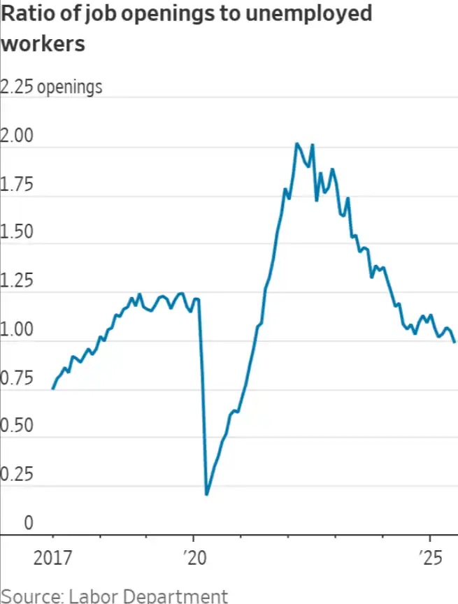 职位空缺与失业人数的比例自 2021 年初以来首次跌破 1。